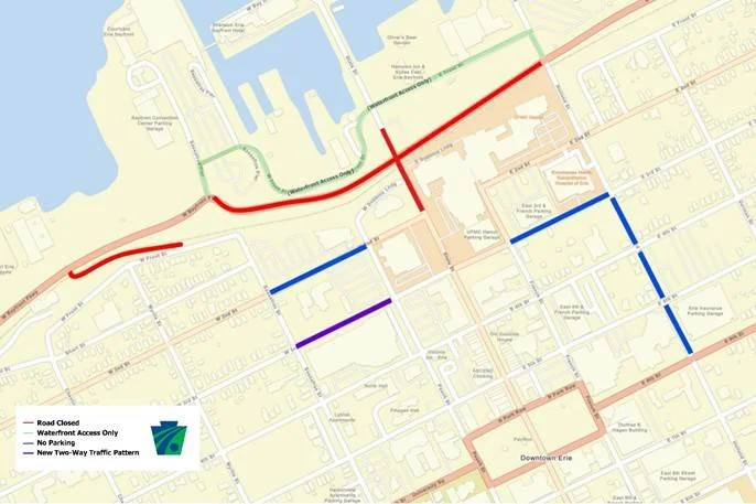 Visitors from the East Bayfront: Follow detours along Front Street as posted.